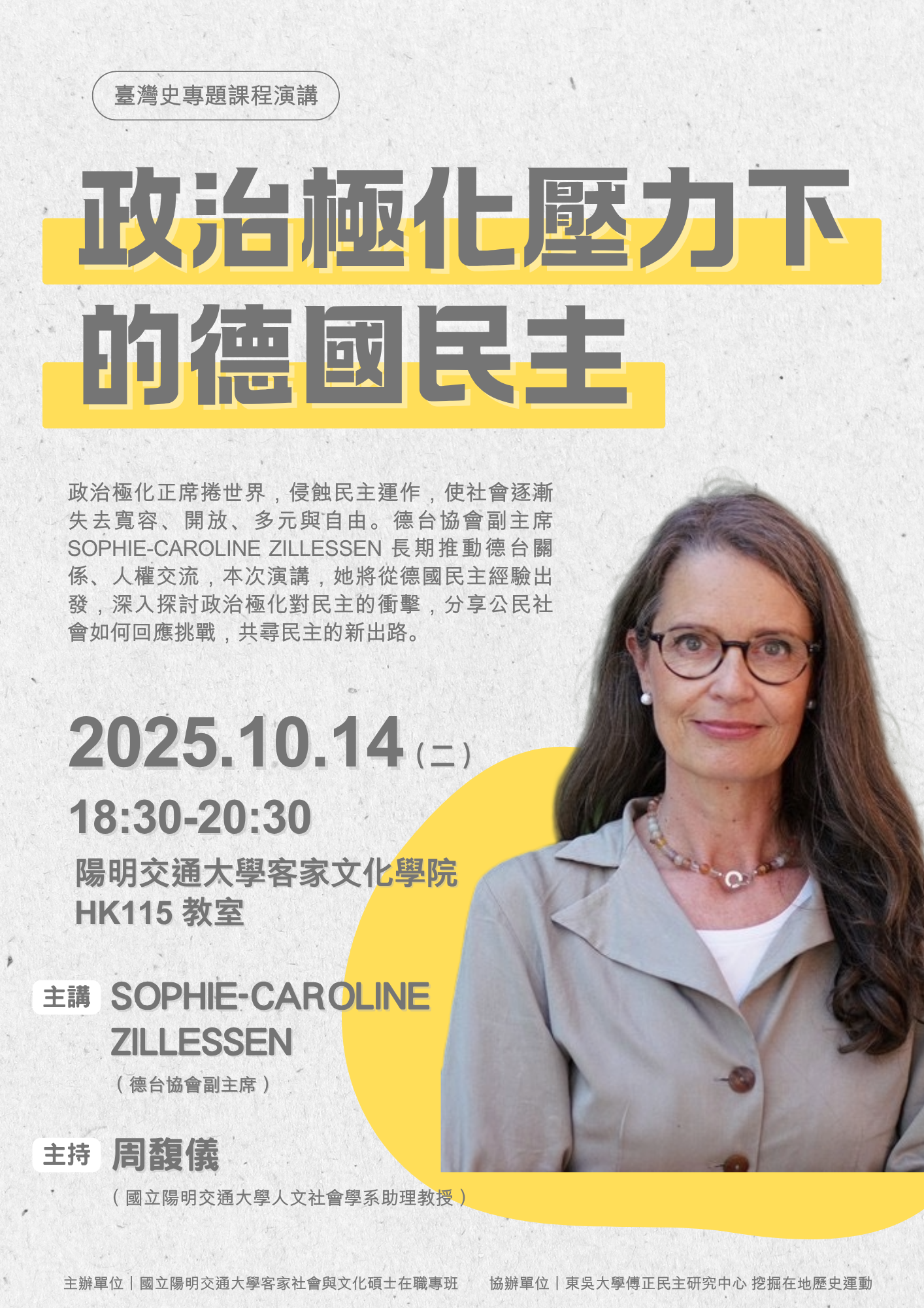 政治極化正席捲世界,侵蝕民主運作,使社會逐漸失去寬容、開放、多元與自由。德台協會副主席 Sophie-Caroline Zillessen 長期推動德台關係、人權交流,本次演講,她將從德國民主經驗出發,深入探討政治極化對民主的衝擊,分享公民社會如何回應挑戰,共尋民主的新出路。